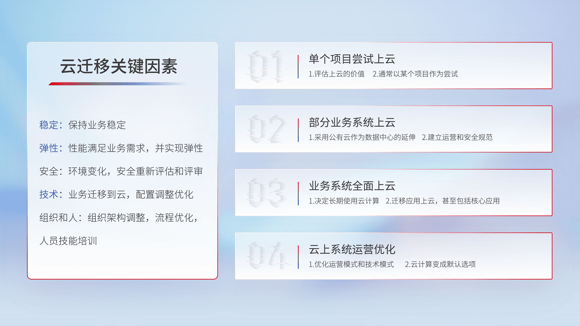 结合实际业务,,从规划设计、、云平台选型、、、云原生改造、、、数据迁移、、、、集成交付,,,,迁移全过程为客户识别最佳上云路径,,,,做好风险识别管理,,,,设计网络架构、、、、身份权限、、、、安全审计合规、、、、操作审计、、、、日志审计、、、监控告警策略、、、多站点容灾设计等,,对云上基础设施进行整体规划,,,提升IT治理水平,,,,以满足弹性、、、高可用、、、、高性能的需求。。。