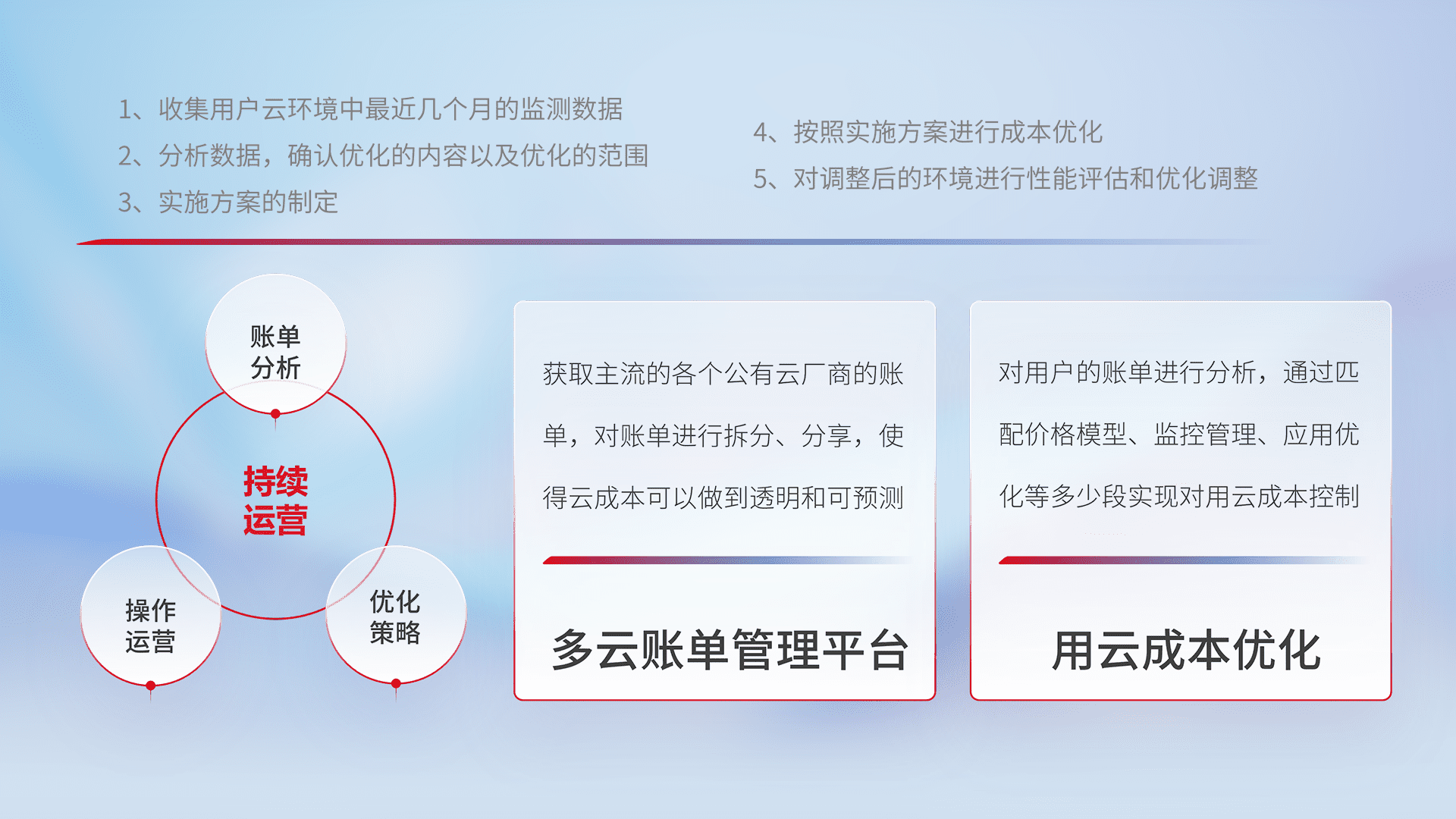 通过多云纳管,,,,以统一的资源数据模型把客户的云资源进行抽象和封装,,,,进而实现对多云资源的统一操作,,,保障云资源管理的可靠性、、稳定性与可用性。。量身定制化运维内容,,配置、、、开发运维、、补丁管理、、、、备份、、、监控、、、认证和访问管理、、审计和日常巡检等,,,,保障在用云过程中的可靠度,,,,稳定度以及高可用率。。。。